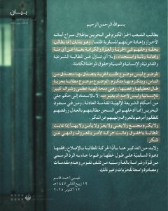 وشدّد على أنّ الحركة المُطالبة بالإصلاح رافقتها دعوة السلميّة على طول خطّها، برغم ما جاء به الردّ الرسميّ من قوّةٍ وشراسةٍ بالغة، وسبّبه من تلف نفوس وهدم مقدّسات ومصادرة واسعة للحرّيات وغير ذلك – بحسب البيان.