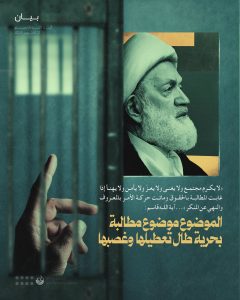 وأشار إلى أنّ الموضوع ليس موضوع طلب الحريّة يتصدّق بها متصدّق من النّاس ويتكرّم بها متكرّم، بل إنّه مطالبة بحريّة طال تعطيلها وغصبها، وهي منحة إلهيّة عظمى وشرف كبير للإنسانيّة، وليس لأحدٍ أن يغيّر منه إلا بالاستناد إلى حكمٍ جليّ من أحكام الشريعة الإلهيّة المقدّسة العادلة، ومَن في سجون البحرين إنّما أدخلهم في السّجن مطالبتهم بالعدل ورفضهم للظلم.