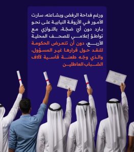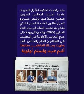 وأكّدت الجمعيّة في بيانٍ أنّ الحكومة أوعزت لمجلس الشّورى «المعيّن»، إلى رفض مشروع تعديل قانون الخدمة المدنيّة، الذي تقدّم به مجلس النواب في يناير/ كانون الثاني 2025، ويمنح البحرينيين أولويّة في التوظيف بالقطاعين العام والخاص، وهو ما شكّل طعنةً قاسيةً لآلاف الشّباب العاطلين في البحرين، وسط تواطؤ إعلاميّ من الصحف المحليّة.