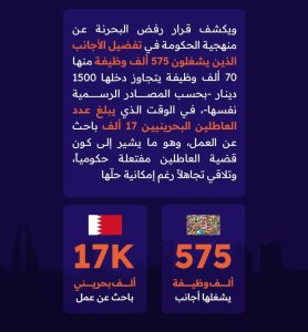 وأضافت أنّ قرار رفض البحرنة كشف عن منهجيّة الحكومة في تفضيل الأجانب، الذين يشغلون «575 ألف» وظيفة منها «70 ألف» وظيفة يتجاوز دخلها «1500 دينار» – بحسب المصادر الرسميّة نفسها، في الوقت الذي يبلغ عدد العاطلين البحرينيين «17 ألف» باحث عن العمل، وهو ما يؤكّد أنّ قضيّة العاطلين مُفتعلة حكوميًا، وتلاقي تجاهلًا رغم إمكانيّة حلّها.