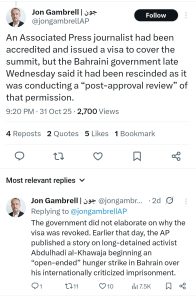 وقال الصحفيّ الأمريكيّ «جون جامبريل» عبر حسابه على «منصّة إكس»، إنّه حصل على اعتمادٍ وتمّ منحه تأشيرة لتغطية «حوار المنامة»، لكن السّلطات البحرينيّة قالت في وقتٍ متأخّر من يوم الأربعاء، إنّه تمّ إلغاء هذا الاعتماد، لأنّها كانت تجري مراجعة ما بعد الموافقة على هذا الإذن – حسب تعبيره.