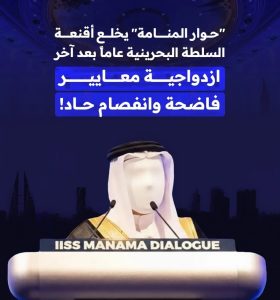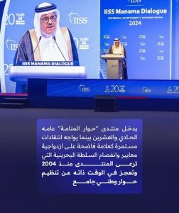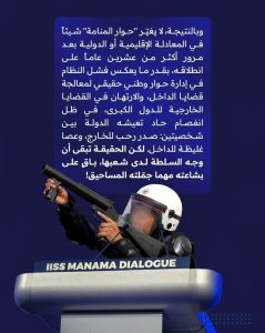 ولفتت إلى أنّ «حوار المنامة» لم يغيّر شيئًا في المعادلة الإقليميّة أو الدوليّة، بعد مرور أكثر من عشرين عامًا على انطلاقه، بقدر ما يعكس فشل النّظام في إدارة حوارٍ وطنيّ حقيقيّ لمعالجة قضايا الداخل، والارتهان في القضايا الخارجيّة للدول الكبرى، في ظلّ انفصامٍ حادّ تعيشه الدولة بين شخصيّتين: صدر رحب للخارج، وعصا غليظة للداخل، لكن الحقيقة تبقى أنّ وجه السّلطة لدى شعبها، باقٍ على بشاعته مهما جمّلته المساحيق – بحسب البيان.