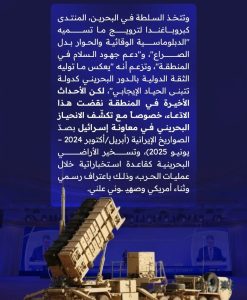 وأضافت أنّ السّلطة في البحرين تتّخذ المنتدى كبروباغندا لترويج ما تسمّيه الدبلوماسيّة الوقائيّة والحوار بدل الصّراع، ودعم جهود السّلام في المنطقة، وتزعم أنّه يعكس ما توليه الثقة الدوليّة بالدور البحرينيّ كدولةٍ تتبنّى الحياد الإيجابيّ، لكن الأحداث الأخيرة في المنطقة نقضت هذا الادّعاء، خاصّةً مع تكشّف الانحياز البحرينيّ في الكيان الصهيونيّ بصدّ الصواريخ الإيرانيّة، وتسخير الأراضي البحرينيّة كقاعدةٍ استخباراتيّة خلال عمليات الحرب، باعترافٍ رسميّ وثناءٍ أمريكيّ وصهيونيّ علنيّ.
