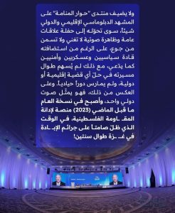 وأكّدت أنّ هذا المنتدى لا يضيف للمشهد الدبلوماسيّ الإقليميّ والدوليّ شيئًا، سوى تحوّله إلى حفلة علاقات عامّة، رغم استضافته قادةً سياسيين وعسكريين وأمنيين كما يُدّعي، فهو لم يُسهم طوال مسيرته في حلّ أيّ قضيّةٍ إقليميّةٍ أو دوليّة ولم يمارس دورًا حياديًا، وعلى العكس من ذلك فهو يمثّل صوتًا دوليًّا واحدًا، وأصبح في نسخة العام ما قبل الماضي «2023»، منصّةً لإدانة المقاومة الفلسطينيّة وظلّ صامتًا على جرائم الإبادة في غزّة طوال سنتين.