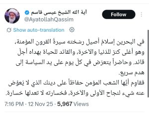 وأكّد «الشّيخ قاسم» عبر حسابه في «منصة إكس» أنّ الدين في البحرين، حاضرًا يتعرّض في كلّ يومٍ على يد السّياسة إلى هدمٍ سريع، ودعا الشّعب البحرينيّ إلى التصدّي ومواجهة هذه الحملات الممنهجة ضدّ الدين.