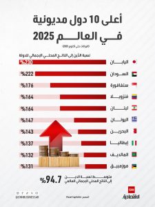 ونشرت الشّبكة «إنفوغراف» يشير إلى أنّ اليابان تصدّرت قائمة الدّول الأكثر مديونيّة بنسبة متوقّعة تبلغ «230%» من الناتج المحليّ الإجماليّ، كما ارتفع حجم الدّين العام في «السّودان» ليبلغ «222%»، في حين ارتفعت نسبة الدّين في البحرين ارتفعت إلى «143%» من الناتج المحليّ خلال 2025، لتحتل بذلك المرتبة الثّانية بعد السّودان في تصنيف الدول العربيّة الأكثر مديونيّة خلال عام 2025.