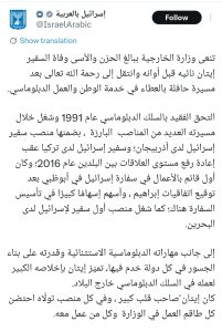 وقالت الوزارة عبر حسابها الرسميّ على «منصّة إكس» إنّ سفيرها الراحل شغل منصب أول سفيرٍ للكيان لدى البحرين، وكان أول قائمٍ بالأعمال في سفارة الكيان في العاصمة الإماراتيّة «أبوظبي» بعد التّطبيع وتوقيع ما يسمّى «اتفاقيات إبراهيم»، وأسهم إسهامًا كبيرًا في تأسيس السّفارة في الإمارات.
