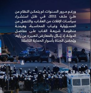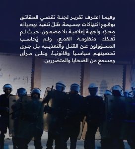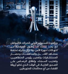 وأضافت أنّ المواطن لم يجد ما يطوي صفحة الانتهاكات الأمنيّة منذ حراك 2011، فلا زالت ذاكرته تحتفظ بمشاهد القتل والمداهمات وحصار المُستشفيات، وتفجير رؤوس المتظاهرين وتعذيب السّجناء وإطلاق الرصاص على الصدور العارية، في الوقت الذي تخلو أروقة القضاء من أيّ محاكماتٍ للمتورّطين.