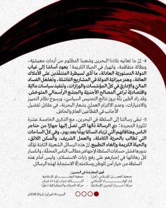 وأشارت إلى أنّ ما تعانيه البلاد وشعبها من أزماتٍ معيشيّة وبطالةٍ متفاقمة وانهيارٍ في الحياة الكريمة؛ يعود إلى غياب الدولة الدستوريّة العادلة، وسيطرة المتنفّذين على الأملاك العامّة، وهدر ميزانيّة الدولة في المشاريع الفاشلة، وتغلغل الفساد الماليّ والإداريّ في كلّ المؤسّسات والوزارات، وتنفيذ سياسات ماليّة واقتصاديّة تراعي المصالح الأجنبيّة والجشع الرأسماليّ، بالإضافة إلى نتائج التجنيس السياسيّ، ونظام التّمييز والامتيازات وعدم الالتزام العمليّ بشعار «البحرنة»، وتفضيل الأجانب في القطاعين العامّ والخاصّ.