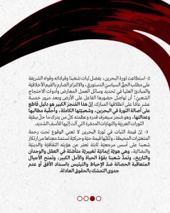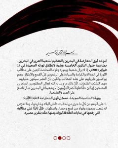 وقالت في بيانٍ مشتركٍ إنّه رغم التحدّيات داخل البلاد وخارجها، وما تعرّض له الشّعب البحرينيّ ورموزه وقواه من قمعٍ وحصارٍ واضطهاد، ظلّ ثابتًا على مطالبه التي رفعها في بدايات انطلاقة ثورته وعلى رأسها حقّه بتقرير مصيره، وثورة البحرين استطاعت بفضل ثبات الشّعب وقياداته وقواه على مطلب الحقّ السياسيّ الدستوريّ، والالتزام بالقيم الأخلاقيّة والمبادئ العليا في اختيار أدوات الاحتجاج؛ أن تواصل حضورها الفاعل على الأرض بعد مرور خمسة عشر عامًا على انطلاقها.