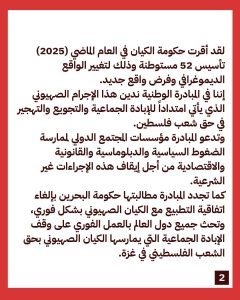 وقالت المبادرة في بيانٍ مشتركٍ إنّ إلغاء تشريعٍ قديمٍ كان يمنع اليهود من شراء أراضٍ بشكلٍ مباشر في الضفّة الغربية منذ 1967، سيطلق العنان لأكبر حملة توسّع للإستيطان، في وقتٍ يعيش فيه أكثر من «750 ألف» مستوطن في الضّفة على حساب أكثر من ثلاثة ملايين فلسطينيّ، وحكومة الكيان أقرَّت في العام الماضي تأسيس «52» مستوطنة لتغيير الواقع الديموغرافيّ وفرض واقعٍ جديد، وهو ما يمثّل امتدادًا للإبادة الجماعيّة والتجويع والتّهجير في حقّ شعب فلسطين.