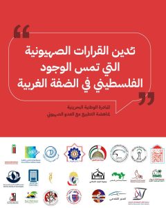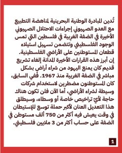 منامة بوست: دانت المبادرة الوطنيّة البحرينيّة لمناهضة التّطبيع، الإجراءات الاستيطانيّة الأخيرة، للكيان الصّهيونيّ في الضّفة الغربيّة المحتلّة، التي تمسّ الوجود الفلسطينيّ وتتضمّن تسهيلًا لاستيلاء قطعان المستوطنين على الأراضي الفلسطينيّة.