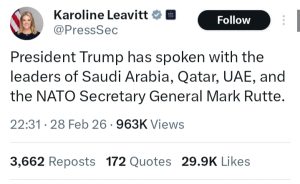 وقالت «ليفيت» عبر حسابها على «مِنصَّة إكس»، «تَحدَّثَ الرَّئيس ترامب مع قادة السعوديّة وقطر والإمارات والأمين العام لحلف الناتو مارك روته»، فيما تأتي هذه الاتصالات على خلفيّة التوتّرات التي تشهدها المنطقة، بعد تنفيذ الولايات المُتَّحدة والكيان الصهيونيّ عُدوانًا مفاجئًا على عددٍ من المُدن الإيرانيّة، بما في ذلك العاصمة طهران يوم السَّبت 28 فبراير/ شباط 2026، وإطلاق الحرس الثوريّ الإيرانيّ «عمليّة الوعد الصادق 4» ردًا على هذا العدوان الأمريكيّ الإسرئيليّ – بحسب «موقع روسيا اليوم» التَّابعِ للخارجيَّةِ الرُّوسيّة.