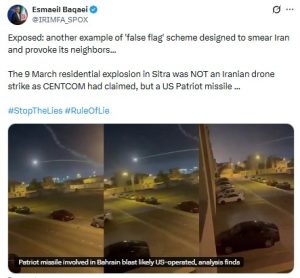 وأضاف أنّه على عكس الادّعاءات الأوليّة لكلّ من البحرين وأمريكا، التي نسبت الانفجار لهجومٍ بمسيّرة إيرانيّة، أفادت وكالة «رويترز» استنادًا إلى تحليلٍ أجراه باحثون أكاديميون، بأنّ «صاروخ باتريوت» أمريكيّ هو المتسبّب في الحادث، وهو ما أقرّ به المتحدّث باسم حكومة البحرين لاحقًا – بحسب الوكالة.