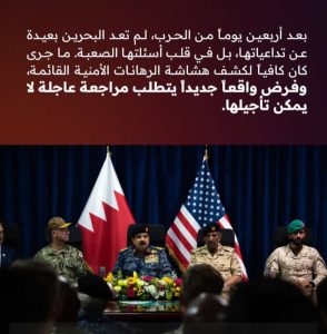 وأضافت أنّه رغم أنّ الحرب لم تبلغ أقصاها إلا أنّ الرسالة كانت واضحة، وهي أنّ البحرين أكثر عرضة لسيناريوهات أشدّ قسوة في أيّ جولةٍ قادمة، ما يضع السّلطة أمام مسؤوليّة مُضاعفة لإعادة النظر في أولويّاتها، وفي ظلّ عالمٍ تتغيّر فيه التّحالفات بسرعة، لم يعد من المسلّم به أن تبقى الضمانات الخارجيّة ثابتة كما كانت، وما يُقال همسًا اليوم قد يتحوّل إلى واقعٍ مكلفٍ غدًا – بحسب البيان.