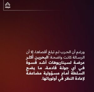 وأشارت إلى أنّ الحوادث التي طالت منازل المواطنين في مناطق «الحدّ وسترة والمحرق» نتيجة تصدّيات فاشلة، عكست الكلفة الحقيقيّة لغياب الحياد، وأظهرت كيف يمكن أن يدفع الداخل ثمن خيارات لا يملك قرارها الكامل، خاصّة وأنّ هناك خللًا واضحًا في بيئة القرار، حيث تستمرّ «نخب التّصفيق» في حجب التّقييم الحقيقيّ للمخاطر، مقابل تغييب الأصوات الصّادقة القادرة على قراءة المشهد بواقعيّة – على حدِّ وصفها.