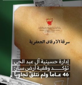 منامة بوست: أكّدت جمعيّة الوفاق الوطنيّ البحرينيّة المُعارِضة، أنّ السّنوات الأخيرة شهدت تصاعدًا في وتيرة السّطو الحكوميّ على الأراضي الوقفيّة، وتحويل ملكيّتها لصالح شخصيات متنفّذة وشركات عقاريّة.