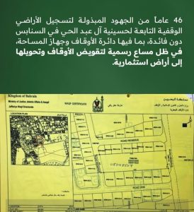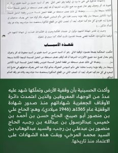 وقالت الجمعيّة في بيانٍ إنّ جهود تسجيل الأراضي الوقفيّة التّابعة إلى «حسينيّة آل عبد الحي» في «بلدة السّنابس»، استمرّت على مدى «46 عامًا» دون فائدةٍ رغم التوجّه إلى دائرة الأوقاف وجهاز المساحة، وسط مساعٍ رسميّة لتقويض الأوقاف وتحويلها إلى أراضٍ استثماريّة.