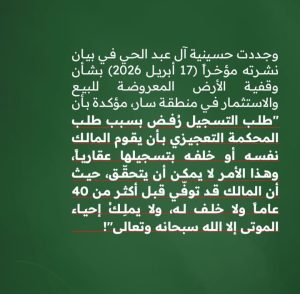 وأضافت أنّ «حسينيّة آل عبد الحي» جدّدت في البيان الأخير بشأن وقفيّة الأرض المعروضة للبيع والاستثمار في «منطقة سَار»، والتأكيد أنّ طلب التّسجيل رُفض بسبب طلب المحكمة التعجيزيّ، بأن يقوم المالك نفسه أو خلفه بتسجيلها عقاريًا وهو ما لا يمكن أن يتحقّق، حيث إنّ المالك قد توفّي قبل أكثر من أربعين عامًا ولا خلف له.