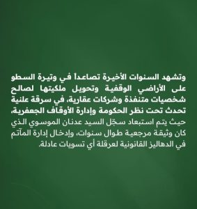 وندَّدت الجمعيّة بالسّرقة العلنيّة التي تحدث تحت نظر الحكومة وإدارة الأوقاف الجعفريّة، حيث يتم استبعاد سجّل «السّيد عدنان الموسوي» الذي كان وثيقة مرجعيّة طوال سنوات، وإدخال إدارة المآتم في الدهاليز القانونيّة لعرقلة أيّ تسويات عادلة – بحسب البيان.